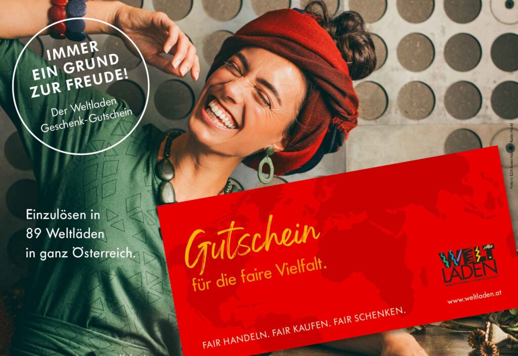 Wenn ihr die Auswahl den Beschenkten selbst überlassen möchtet, sind Gutscheine eine tolle Alternative. In 89 Weltläden in ganz Österreich können eure Lieben unser Genuss- und Lifestyle-Sortiment entdecken und aus der fairen Vielfalt exotischer Lebensmittel, Kaffee, Tee, Schokoladen, Handwerkskunst, Fair Fashion und bio-fairer Kosmetik auswählen.
